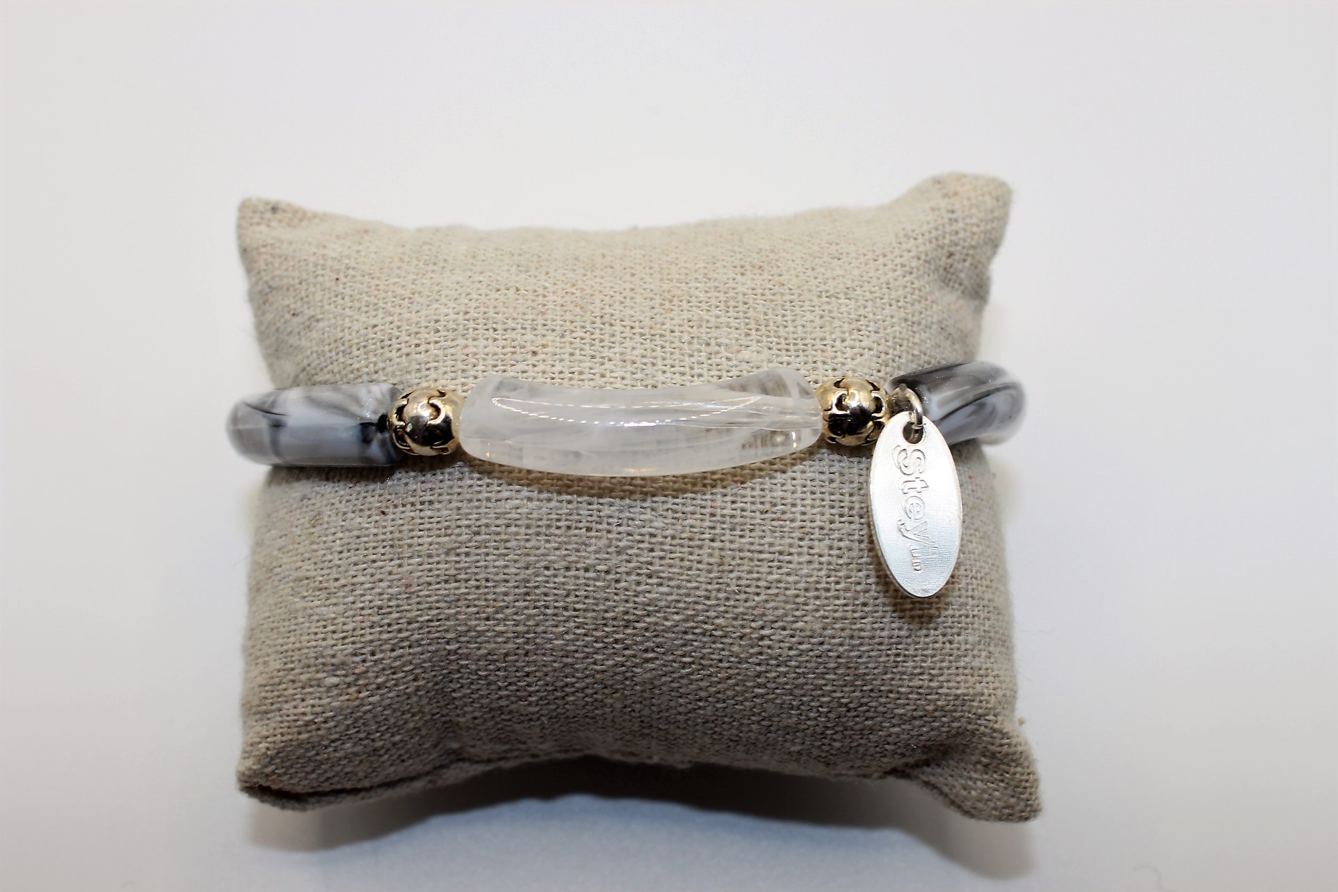 De trend op dit moment, grijs, zilver en gemarmerde tube kralen. Tussen de tube zitten zilveren bewerkte kralen.