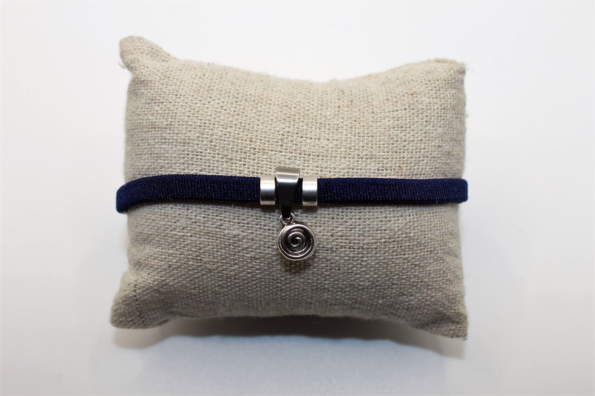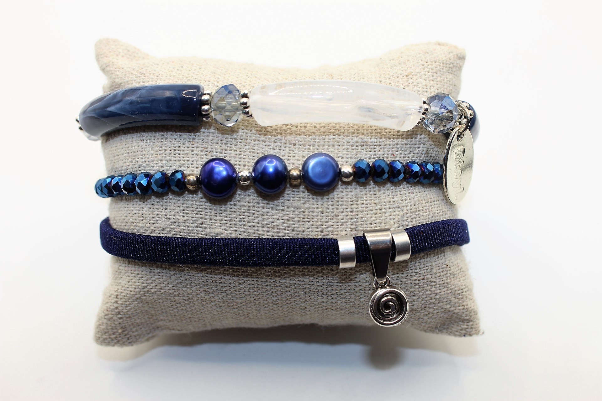 Mooie donker blauw elastische lint armband met zilveren ornamenten en bedel.