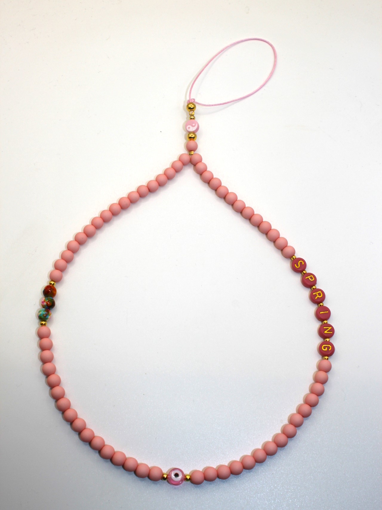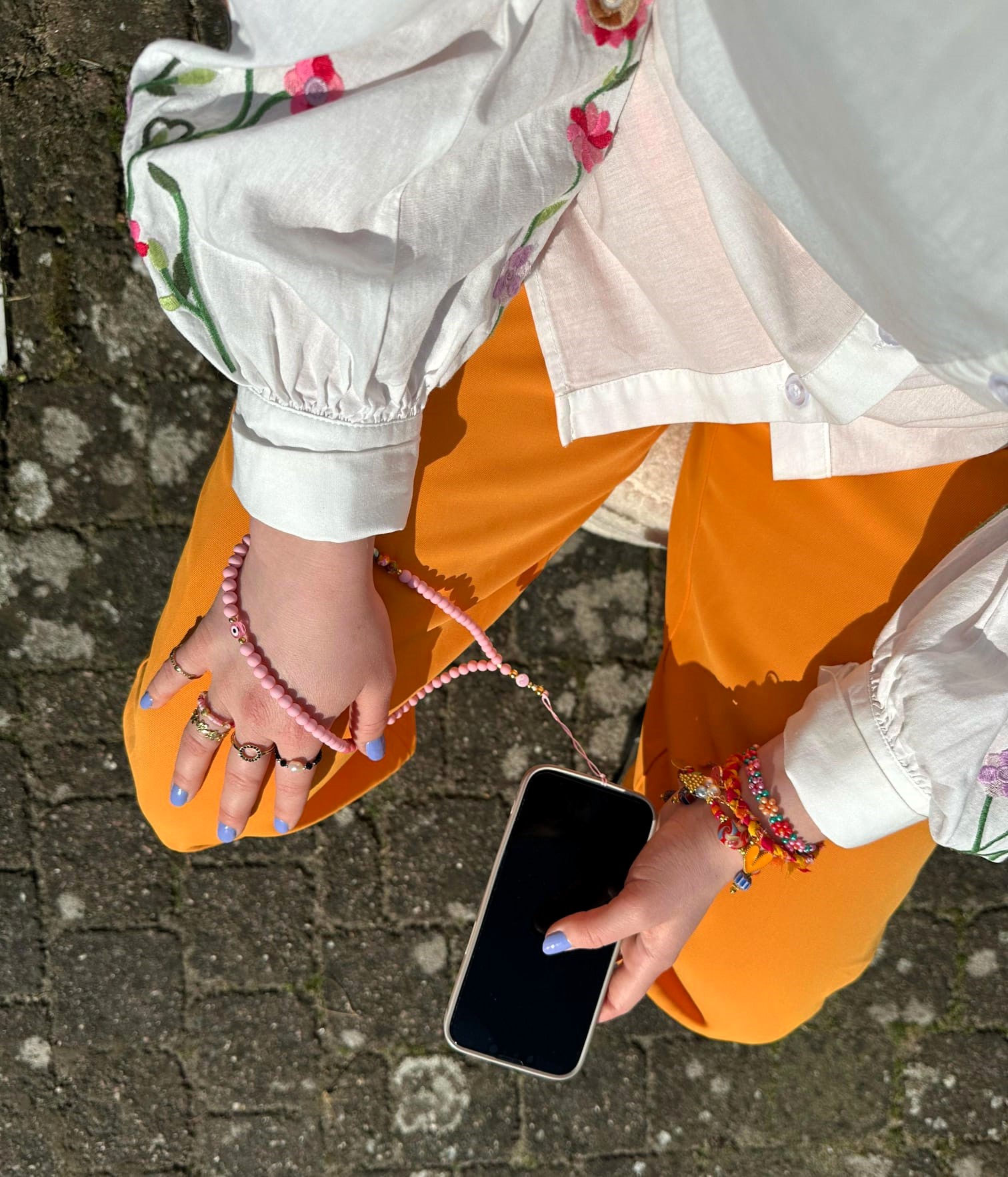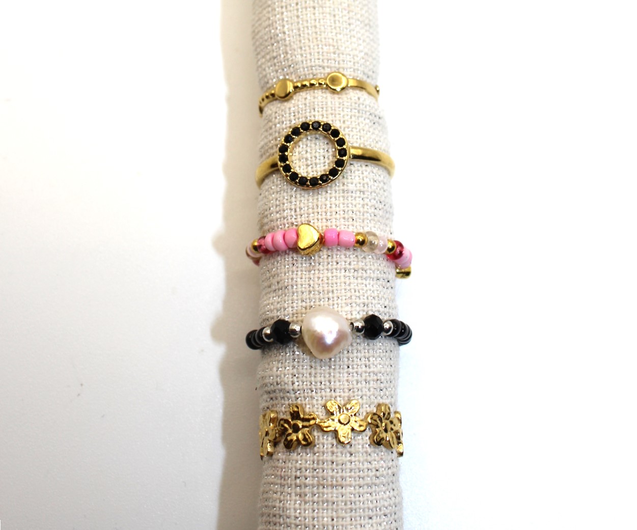 Verschillende soorten ringen, de roze en zwarte ringen zijn geregen op elastiek met hartjes en zoetwaterpareltje.