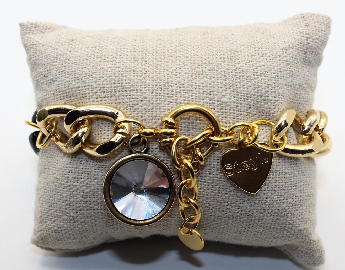 Mooie schakelarmband met zwarte Acryl schakel ertussen en een bedel met een Swarovski kristal. De armband wordt gesloten met een boeislot.